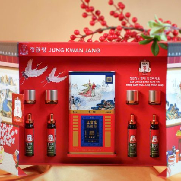 Set quà An Khang Vạn Thọ không chỉ gây ấn tượng với thiết kế hộp đỏ vàng rực rỡ mang đậm sắc xuân, mà còn chứa đựng những tinh hoa hồng sâm cao cấp đến từ thương hiệu danh tiếng Jung Kwan Jang (KGC) – biểu tượng của uy tín và chất lượng Hàn Quốc suốt hơn 120 năm.