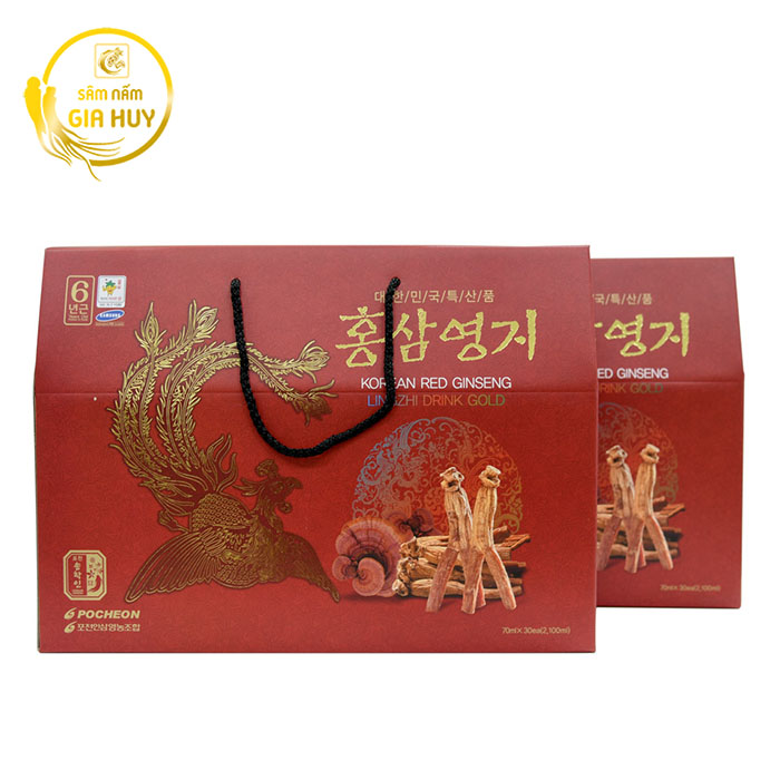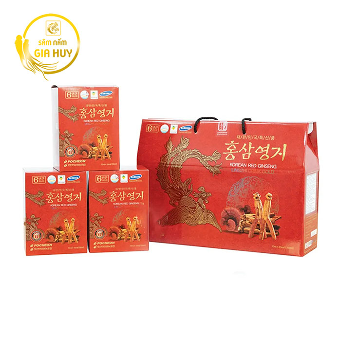 Nước Hồng Sâm Linh Chi Pocheon Hàn Quốc hộp 70ml x 30 gói được chiết xuất từ nhân sâm 6 năm tuổi, kết hợp cùng nấm linh chi, nhung hươu, đương quy, xuyên khung, địa hoàng, táo đỏ và nhiều thảo mộc quý khác.