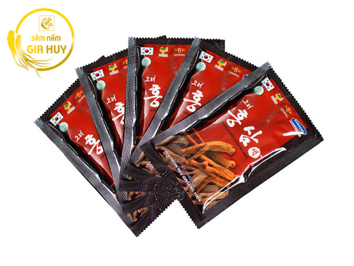 Mỗi gói nước hồng sâm là sự kết hợp tinh tế giữa hồng sâm 6 năm tuổi và nhiều thảo dược quý phương Đông như táo đỏ, địa hoàng, xuyên khung, cam thảo, đương quy, ngải cứu, nấm linh chi và vỏ quế.