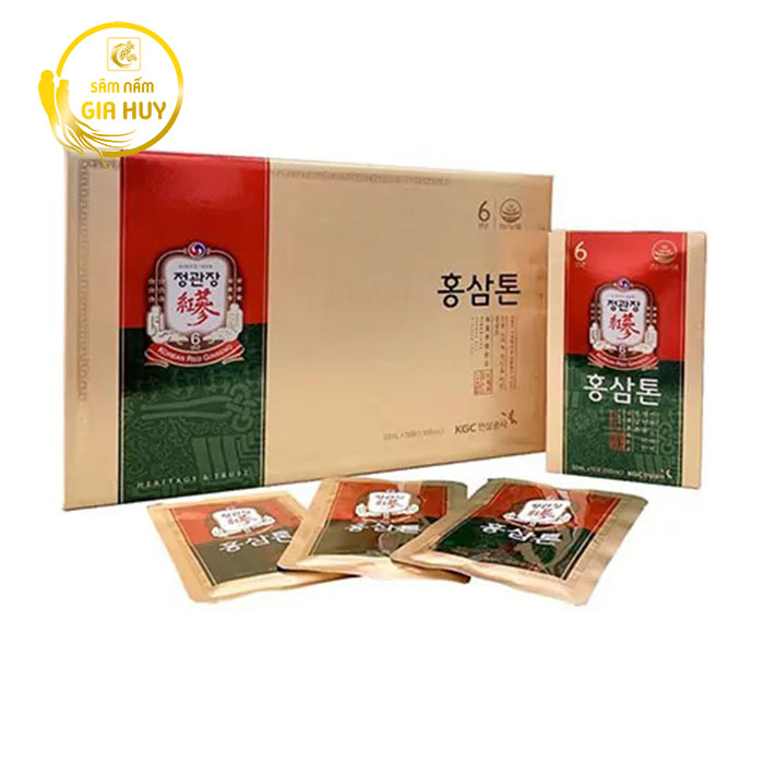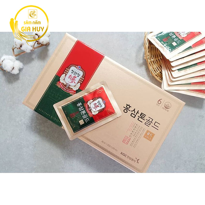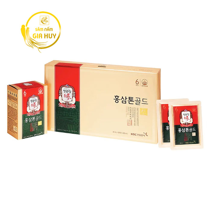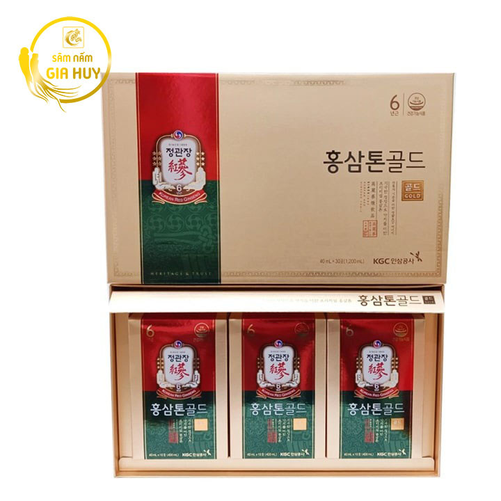 Nước Hồng Sâm Tonic Gold Jung Kwan Jang Hàn Quốc hộp 40ml x 30 gói được chiết xuất từ những củ hồng sâm đạt chuẩn 6 năm tuổi – giai đoạn nhân sâm chứa hàm lượng dưỡng chất cao nhất. Kết hợp cùng các loại thảo dược quý như chiết xuất táo, nấm hương, cam thảo, mật ong và rễ Angelicae, sản phẩm mang lại nguồn năng lượng tự nhiên, giúp cơ thể khỏe mạnh và tỉnh táo suốt cả ngày.
