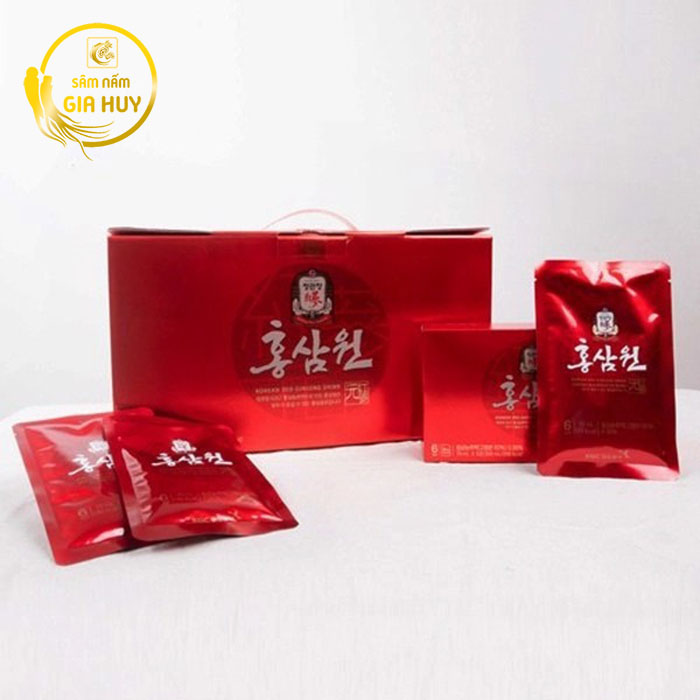 - Thành phần chính: Nước tinh khiết, chiết xuất hồng sâm cô đặc 6 năm tuổi, quế, kỷ tử, táo, gừng khô, đường mạch nha, axit xitric, hương liệu tự nhiên.